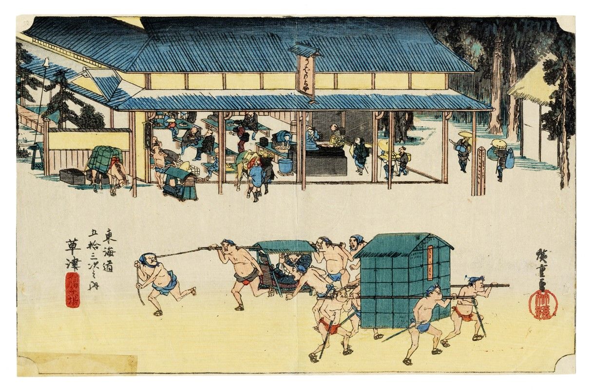 Xilografia a colori (nishiki-e). Formato: ôban orizzontale (mm 225x352). Firma: Hiroshige ga. Editore: Takenouchi Magohachi (Hoeidô). Censura: kiwame (non presente in quanto posizionato al margine sinistro, qui mancante). Data: 1833–34 ca. (Tenpô 4–5). Serie: Tôkaidô gojûsan tsugi no uchi (Le cinquantatre stazioni della Tokaido).