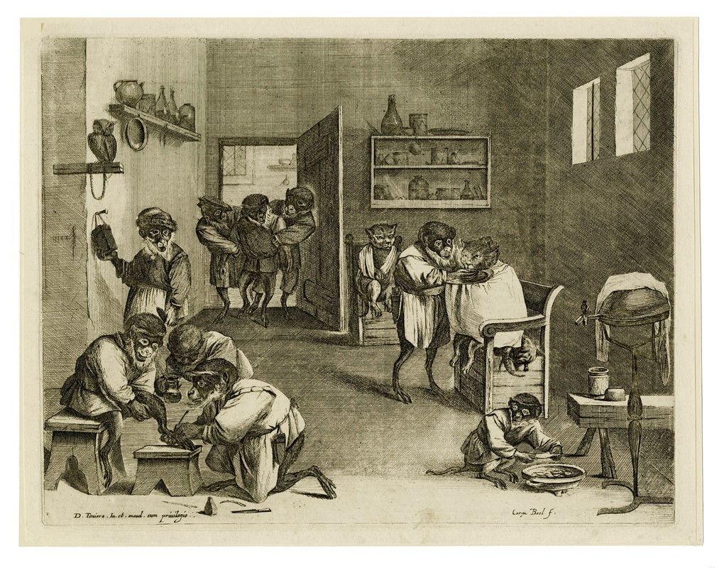 Acquaforte e bulino. mm 253x320. Foglio: mm 268x338. Le Blanc, 52. Hollstein, 42. Sulla lastra in basso da sinistra a destra "D. Teniers In. et excud. cum priuilegio." a seguire "Corijn Boel f.". Da un dipinto su rame di David Teniers il giovane conservato presso l'Herzog Anton Ulrich-Museum di Braunschweig (inv. no.139).