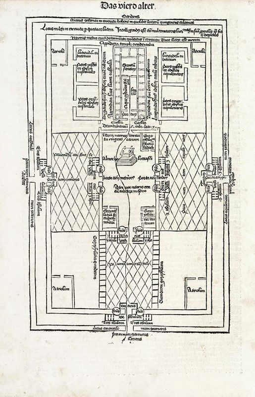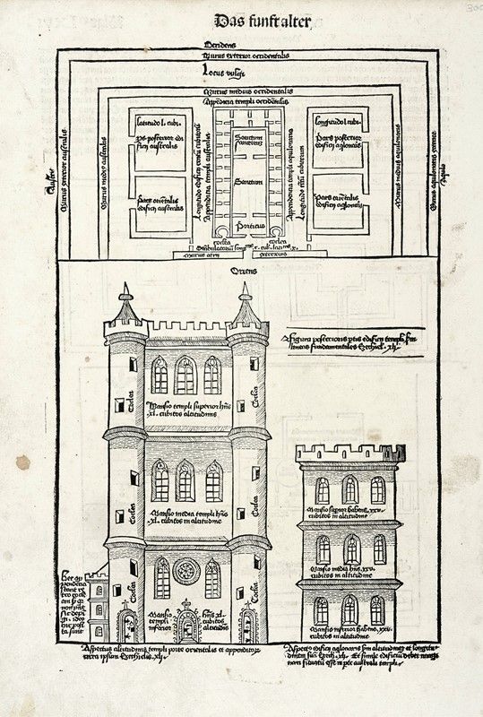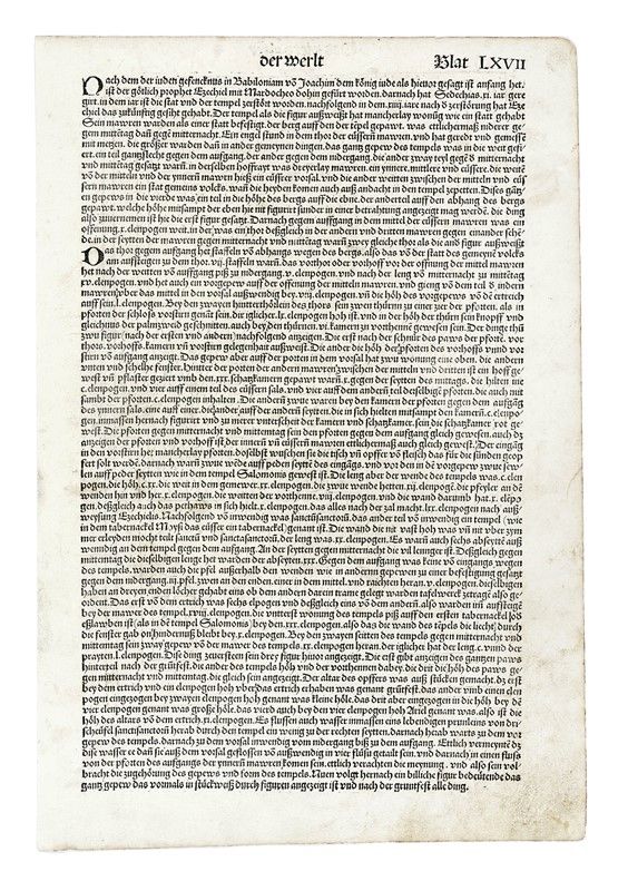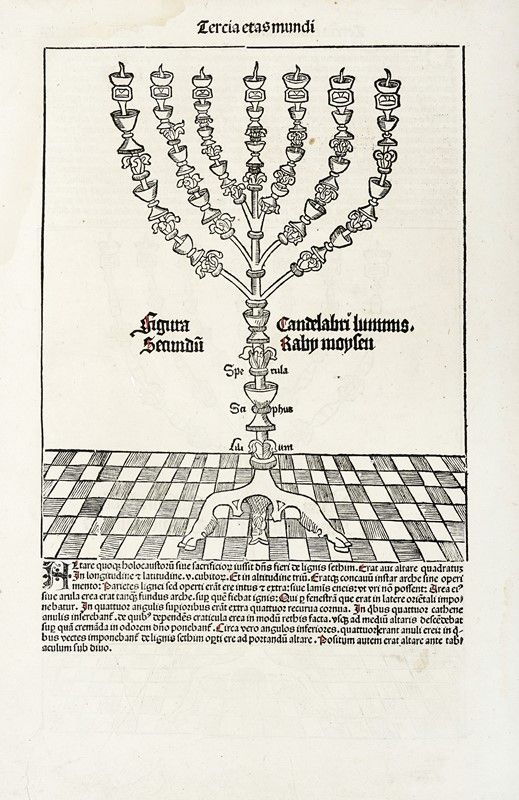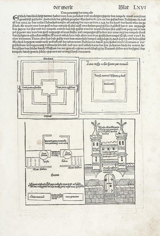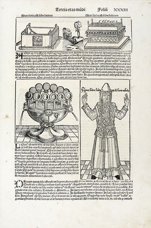Xiografia. mm 330x230. Foglio: mm 450x315. Quattro tavole di Judaica con illustrazioni su entrambi i lati, alcune dall'edizione latina altre dalla tedesca, del Liber chronicarum. Nuremberg: Anton Koberger per Sebald Schreyer e Sebastian Kammermeister, 12 luglio 1493. Tra i primi libri stampati e sicuramente il più ampiamente illustrato del XV secolo, la Cronaca vide coinvolte negli intagli e nella redazione del progetto molte personalità tra le quali il pittore ed incisore Michael Wohlgemut (Norimberga 1434-1519) e il suo figliastro Wilhelm Pleydenwurff (Norimberga c. 1450-1494); lo stampatore Anton Koberger (Norimberga ca. 1440-1513), gli editori e mecenati Sebald Schreyer (Norimberga 1446-1520) e Sebastian Kammermaister (1446-1503).