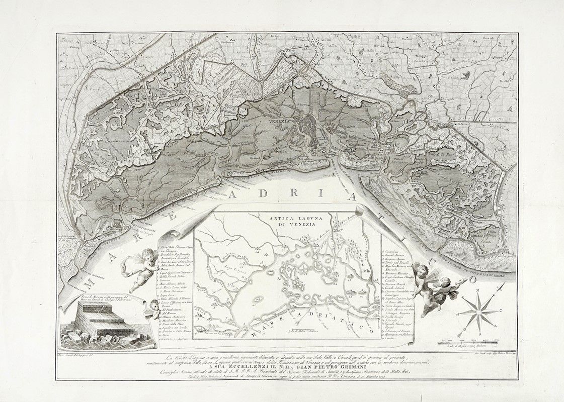 Incisione in rame. mm 475x627. Foglio: mm 555x793. Al margine inferiore sotto l’inciso a sinistra "Alvise Grandis ingegnere delin." e a destra la firma, al centro il titolo e la dedica a Gian Pietro Grimani. Al centro della tavola in basso quattro putti reggono un grande cartiglio a rotolo con l'antica pianta della laguna e una legenda con 41 rimandi a luoghi di interesse. A destra rosa dei venti e a sinistra la "Forma dei Murazzi eretti per riparo del mare nei littorali di Chioggia e Pellestrina".