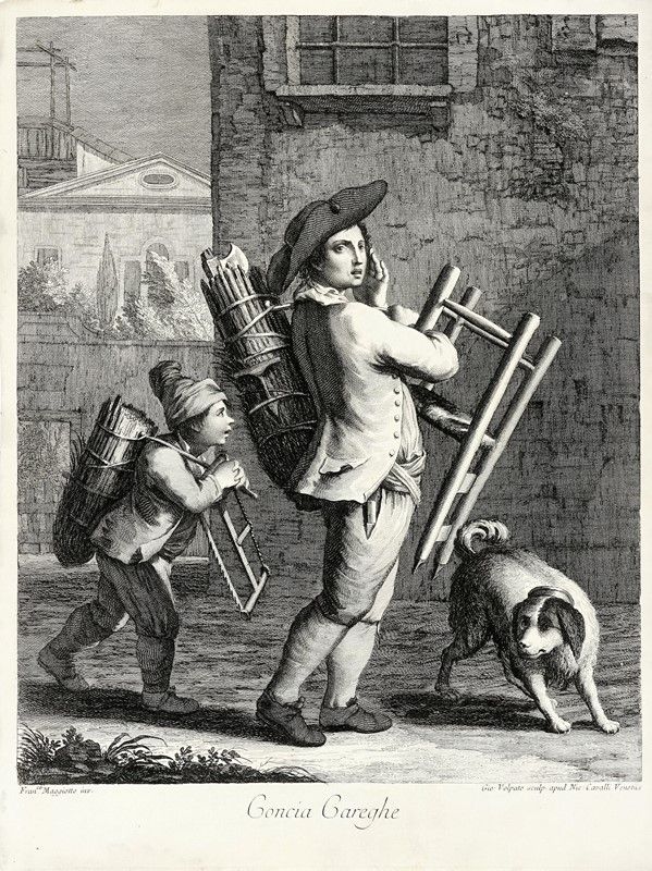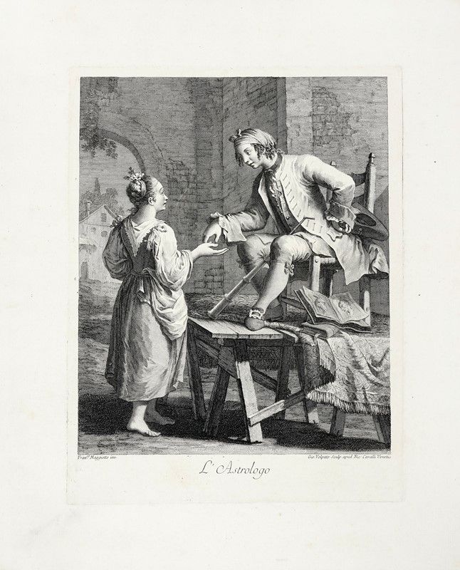 Acquaforte e bulino. mm 380/382x293. Foglio: mm 380/533x288/440. Marini, 62, 63,68. Tre tavole da Le arti per via, serie di dodici incisioni dedicate ai mestieri di strada e tratte da dipinti di Francesco Maggiotto. Bellissime prove di grande freschezza dall'edizione veneziana di Niccolò Cavalli, stampate su carta vergellata con filigrana "tre mezzelume e contromarca" visibile su due tavole, "piccolo stemma con lettere A.S" visibile sulla restante.