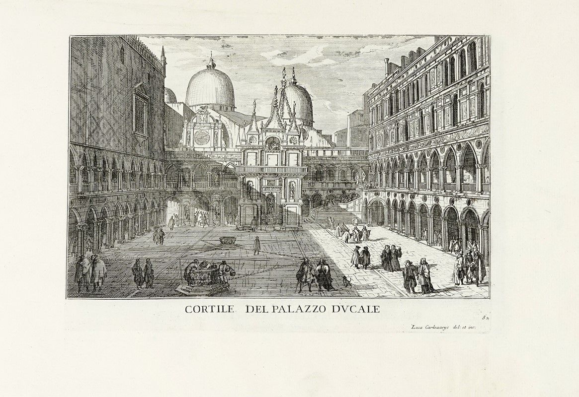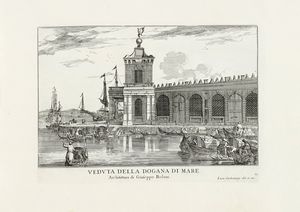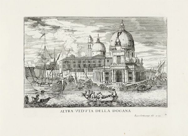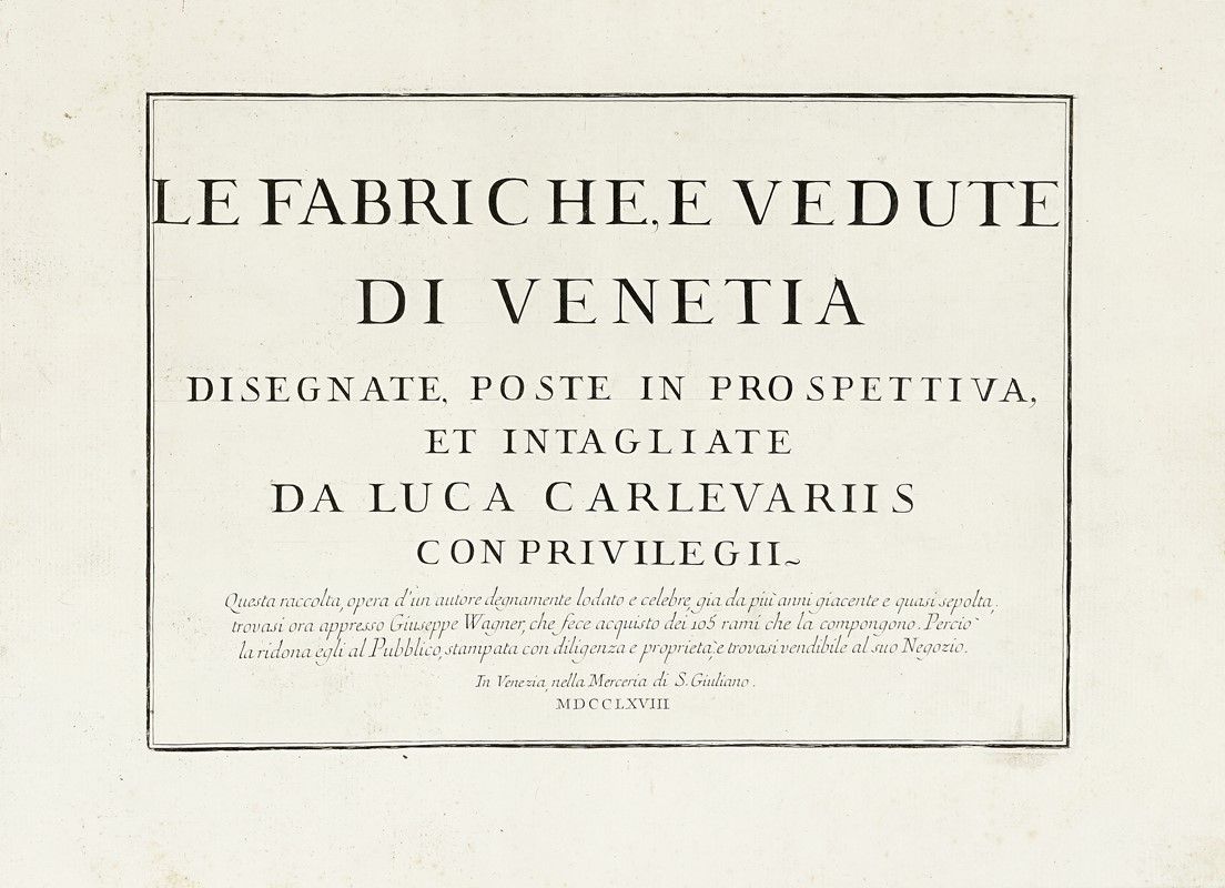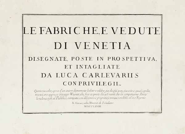 In-folio oblungo (mm 295x430). Succi (Da Carlevarijs ai Tiepolo), 98-127.Succi (2013), p. 20. Esemplare comprensivo di titolo, frontespizio inciso con veduta di Venezia e dedica al serenissimo Prencipe Luigi Mocenigo Doge di Venezia, con la data 27 Maggio 1703, 103 vedute di Venezia incise all'acquaforte (mm 205/208x292. Foglio: mm290x420, 101 numerate in basso a destra, le ultime due in basso a sinistra). Bellissime prove stampate con inchiostrazione piena e brillante su carta vergellata con filigrana tre mezzelune visibile sulla gran parte dei fogli. Tavole 1-101 nel II stato di 3 dopo la comparsa del numero e le correzioni ortografiche al titolo di alcune, tavole 102 e 103 nel I stato su 2, prima della comparsa del nome dell'editore Predali. Esemplare in IV edizione con l’aggiunta, sulla lastra con il titolo, della scritta Questa raccolta, opera d'un autore degnamente lodato e celebre,... In Venezia, nella Merceria di S. Giuliano/ MDCCLXVIII'', e delle tavole 102 e 103 con Palazzo Zanne e Casino Zanne. Legatura in cartonato color verde scuro. Al dorso autore, titolo e anno impressi in oro.