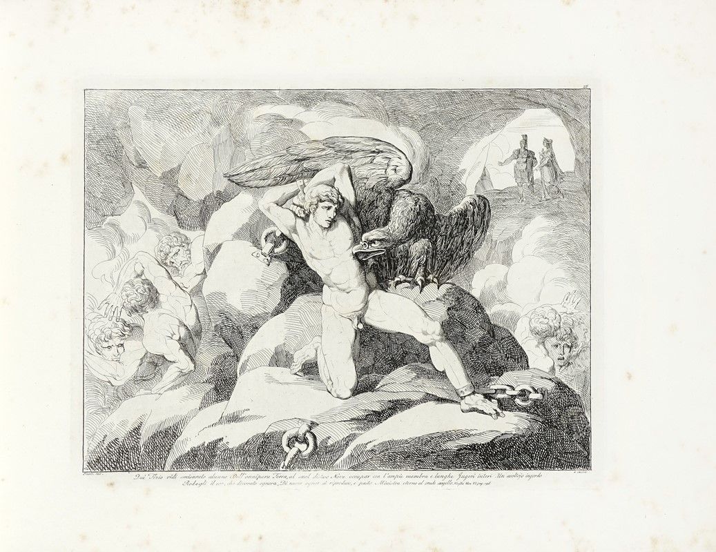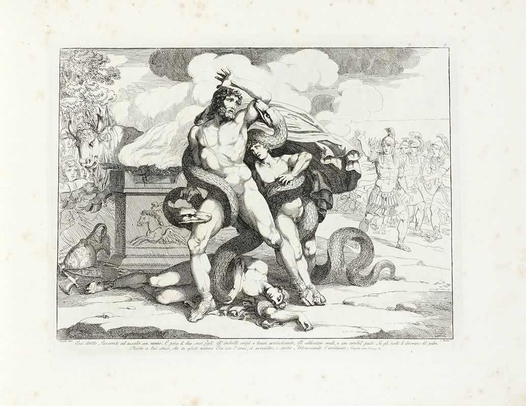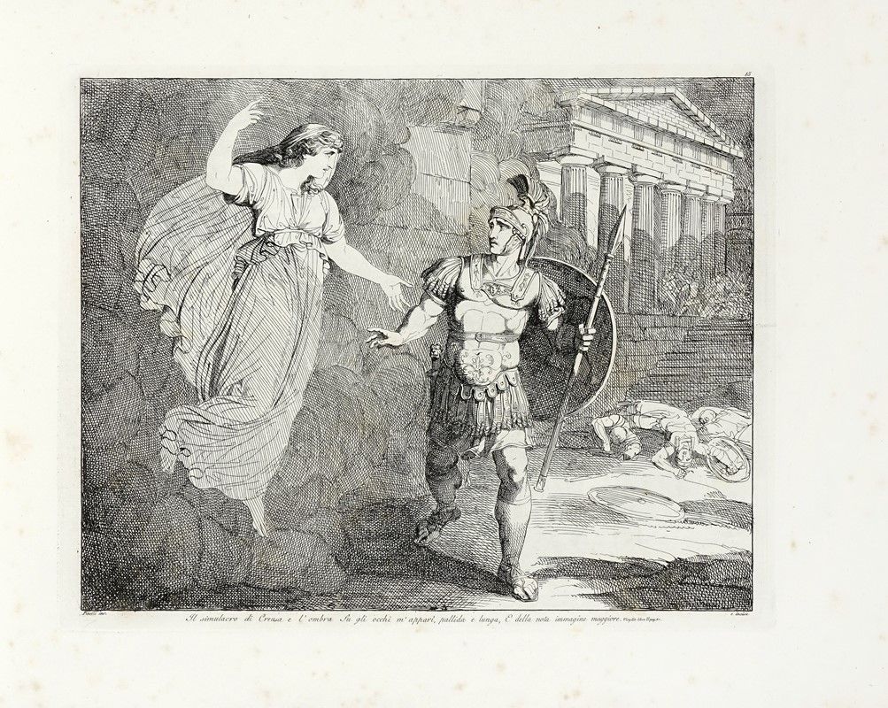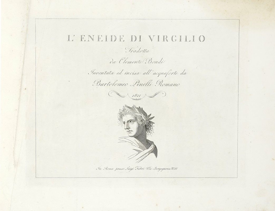 Album in-folio oblungo (mm 363x4755). Frontespizio inciso e 50 tavole ad acquaforte e bulino ciascuna recante al margine inferiore la firma “Pinelli inventò e incise” e testo esplicativo dell'episodio epico. Legatura in mezza pelle, piatti in cartonato marmorizzato coevo color rosso. Dorso in pelle verde scuro con nervature e piccole decorazioni impressi in oro. Al piatto anteriore tassello in pelle verde per il titolo, impresso in oro come la sua cornice decorata.
