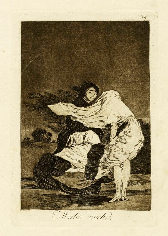 Acquaforte e acquatinta brunita. mm 215x150. Foglio: mm 327x240. Harris, 71. Con il titolo al margine inferiore e il numero in alto a destra. Trentaseiesima tavola da Los Caprichos serie in 80 tavole pubblicata per la prima volta dallo stesso Goya nel 1799, ed edita in complessive 12 edizioni. Bellissima prova nel III stato su 3, comune a tutte le impressioni editoriali, stampata a inchiostro nero e seppia su carta lievemente spessa non vergellata priva di filigrana. Esemplare compatibile per dimensioni del foglio con la V edizione, dopo la bisellatura della lastra, stampata dalla Calcografia per la Real Academia tra il 1881 e il 1886.