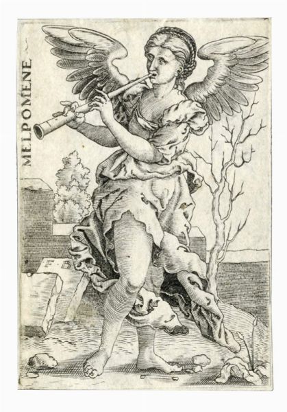 Bulino. mm 72x49. Bartsch, IX, 19. Hollstein, 27. Con il monogramma nella tavoletta di pietra in basso a sinistra. Da una serie di nove tavole dedicata alle Muse. Bella prova su carta vergellata sottile. Al verso marchio della Hamburger Kunsthalle (Lugt, 1328) e del marchio Hamburger Kunsthalle doublette (Lugt, 626).