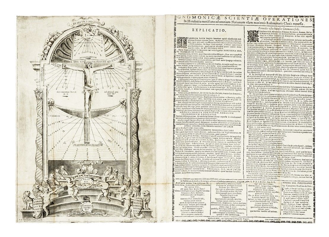 Bulino. mm 367x250. Foglio: mm 367x534. Raffigurazione di orologio solare all'interno di un'elaborata immagine con Cristo crocefisso al centro: la chiave di lettura sia iconologica che scientifica viene fornita con i testi latini nella pagina di testo adiacente, sul medesimo foglio, divisa in "Explicatio" e "Perutilis usus huiusce Gnomonici folii". In basso a sinistra sull'incisione si legge: "P. D. Virmondus coin invent", in basso a destra la firma "Franciscus Curtus Bonon. incidit". La tavola del Curti è inserita al centro di In Horologia solaria Omnibus Mundi Nationibus accepta, usus, et Compendium di Francesco Maria Bordocchio (cfr. Indice biografico italiano, a cura di T. Nappo, Munchen, K. G. Saur, 2002, vol. 2, p. 664), Bononia, typis Iacobi Montij. 1675". Altro esemplare all'interno del manoscritto Gesuitico, Ges.561 (c.189), Roma, Biblioteca Nazionale Centrale.