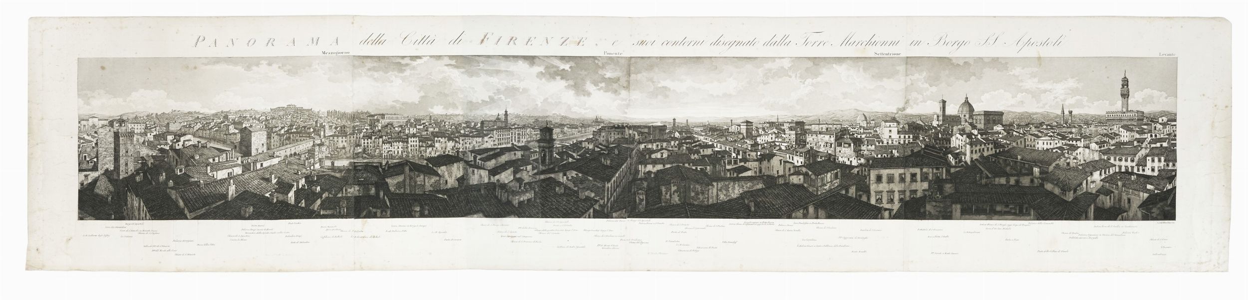 Incisione in rame, acquatinta su quattro lastre. mm 1480x290. Foglio: mm 1527x310. Mori/Boffito, p. 118. Con il titolo in alto e in basso a destra "L. Garibbo dis. e inc.". Al margine inferiore rimandi non numerati ai luoghi con tratteggio indicativo in corrispondenza dell'immagine nell'inciso. La veduta non è datata, l'anno di esecuzione "1865" è stato desunto da una lettera che Garibbo inviò insieme a un esemplare di questo suo grande panorama a Giacomo Tartagli e datata "31 gennaio 1865". Veduta di grande rarità. La tavola è pervenuta in custodia cilindrica in cartone pesante ricoperto di carta marmorizzata con tassello in carta con la scritta "Panorama di Firenze".