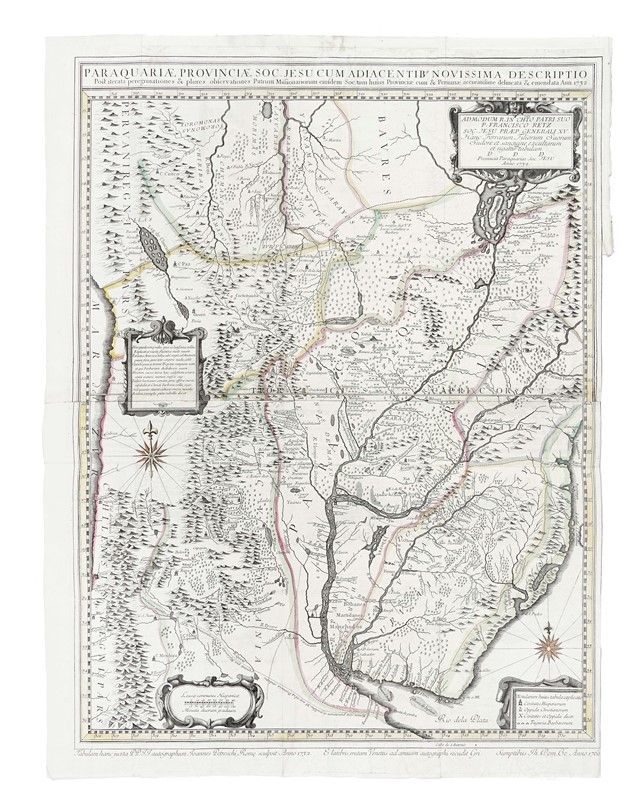 Incisione in rame con confini in coloritura. mm 745x565. Foglio: mm 760x580. Pubblicata nel 1726 e attribuita a Juan Francisco D’Ávila, Paraquaria Provinciæ soc. Jesu cum Adjacentib Novissima Descriptio[...]., raffigura il Paraguay riportando riferimenti a località già menzionate nelle mappe del XVII secolo. È dedicata all'allora Generale dell'Ordine, il Padre Michelangelo Tamburini (1648-1730), e come si legge nella tabella esplicativa, si tratta di un tentativo di mostrare le terre che i sacerdoti conoscevano ed evangelizzavano. Nel 1732 la mappa uscì in altra versione ad opera di Giovanni Petroschi, anch'essa dedicata al Generale dell'Ordine, Padre Francisco Retz (1673-1750); verrà edita nuovamente nel 1760 a Venezia, stampata in una bottega non appartenente all'Ordine Gesuita. Si trova poi inserita nell'opera del padre domenicano Jean-Pierre Viou, Novelle interessanti in proposito degli Affari del Portogallo. In Berna, nella Stamperia della Reggenza Elvetica, 1760-61 (ma verosimilmente edita a Venezia).
