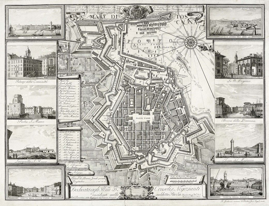 Incisione in rame. mm 535x704. Foglio: mm 554x725. Frati, 164 (riprodotta). Al margine inferiore a destra "R. Spadaccini contornò la Pianta, e Gius. Angeli incise". In basso al centro la dedica di Antonio Piemontesi "agli ill.mi SS.ri Consoli, e Negozianti residenti nella suddetta Piazza [Piazza d'Arme]" con vignetta raffigurante il faro con la Gorgona sullo sfondo; a seguire l'indicazione di responsabilità del disegno dovuta allo stesso "Ant. Piemontesi detto Baseggio di Vienna disegnò". In alto al centro stemma e bandiera di stato del Granducato di Toscana con ai lati il titolo entro cartiglio a nastro. A sinistra nella composizione la legenda dei luoghi con 32 rimandi. Su entrambi i lati della mappa 5 piccole vedute dei luoghi di maggior interesse. Bibliografia: Piero Frati, Livorno nelle antiche stampe. Piante e vedute della città dalla fine del secolo XVI alla fine del secolo XIX, Livorno 2000.