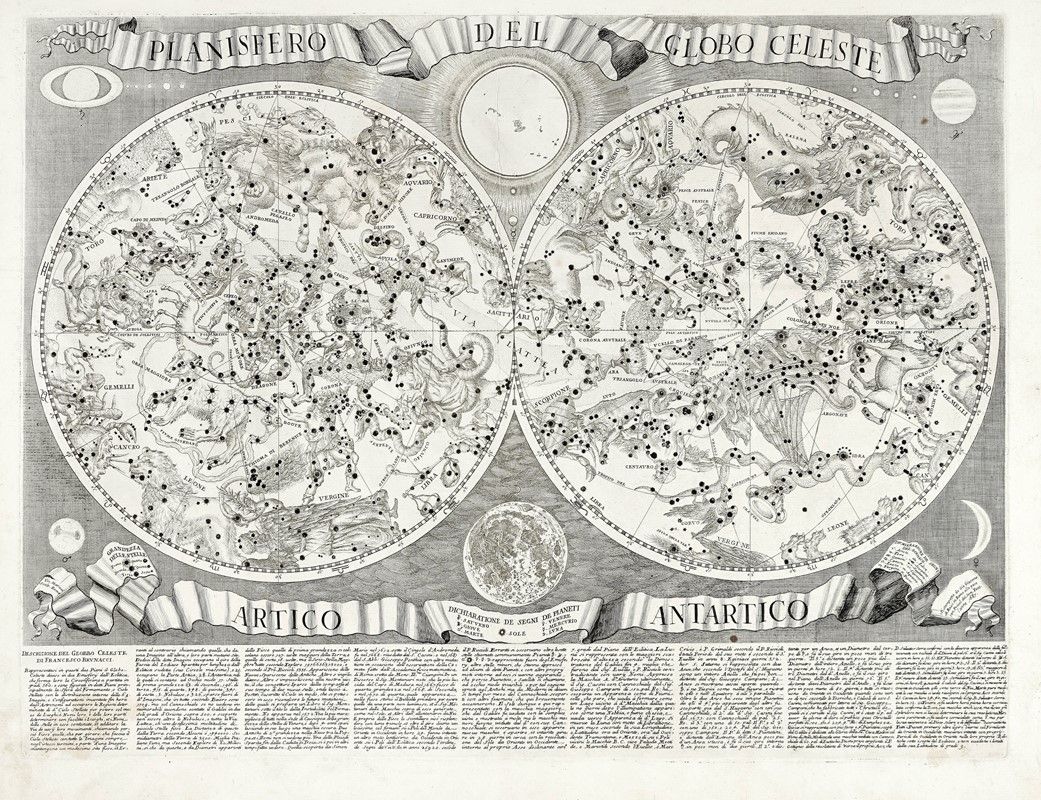 Incisione in rame. mm 424x565. Foglio: mm 467x610. All'estremità sinistra del cartiglio a nastro la firma dell'incisore Vincenzo Mariotti (Roma, 1650 ca. - Murano, 1734), all'estremità destra i dati editoriali. La tavola raffigura le 67 costellazioni al tempo note: le 48 tolemaiche, le nuove 12 costellazioni dell'emisfero meridionale introdotte da Keyser e Houtman, Ganimede, Chioma di Berenice, Pardocamelo, Fiume Giordano, Alicorno, Columba di Noe e il Crociero. Al circolo polare antartico compaiono la Nuvola Minore e la Nuvola Maggiore, e tra le stelle più luminose viene indicato il nome de la Capra e la Spiga della Vergine. Le stelle sono suddivise per magnitudine in sei classi. Al margine inferiore su nove colonne un testo esplicativo dell'autore dove dichiara di aver seguito l'Uranometria del 1603 di Bayer. Commenta inoltre le osservazioni e le scoperte significative degli ultimi decenni di cui ci presenta, come cornice dei planisferi, quelle che riguardano il Sole, la Luna, Saturno, Giove, Marte e i pianeti cornicolati Venere e Mercurio. Il Planisfero Artico e quello Antartico sono rappresentati in proiezione stereografica polare eclittica convessa. Il reticolo centrato sul polo dell'eclittica ci permette di leggere la longitudine delle stelle con la precisione di un grado, ogni trenta troviamo una linea di longitudine, mancano i cerchi di latitudine. Sono invece evidenziati i circoli polari, quelli dei tropici, i coluri e il circolo equinoziale. I due planisferi sono uniti dal coluro dei solstizi nella costellazione del Sagittario.