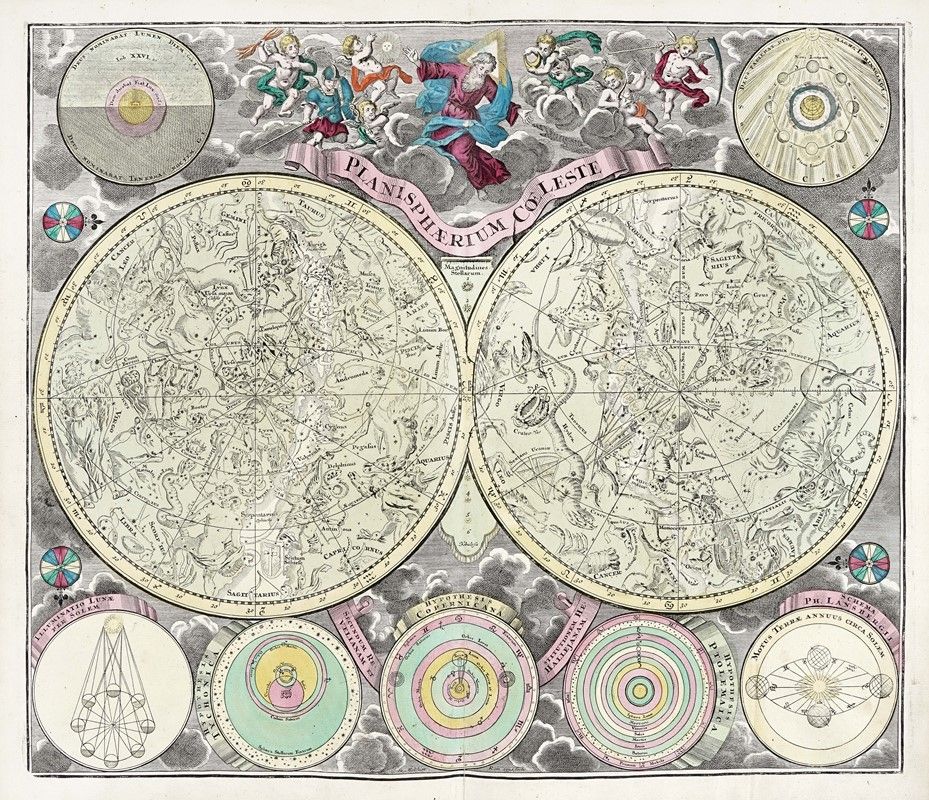 Incisione in rame in coloritura. mm 505x584. Foglio: mm 543x627. Nell'inciso in basso al centro "Sc. Melchior Rein aquaforte". Da Atlas Novus sive Tabulae Geographicae Totius Orbis Faciem, Partes, Imperia, Regna et Provincias Exhibentes Exactissima Cura Juxta Recentissimas Observation Aeri Incisae et Venum Expositae a Matthaeo Seutter Chalcogr., pubblicato per la prima volta ad Augsburg nel 1730. Bellissima mappa celeste a doppio emisfero, con il cielo settentrionale e meridionale e le costellazioni allegoriche, sette diagrammi astronomici più piccoli agli angoli in alto e nella fascia inferiore. In alto al centro il titolo in cartiglio a nastro e la creazione del mondo secondo la descrizione biblica, in alto a destra e in basso a sinistra l'orbita mensile della Luna, accanto le varie ipotesi planetarie di Tycho Brahe, Copernico e Tolomeo, oltre all'orbita annuale del sole con le quattro stagioni. Prima edizione con ancora in basso la firma dell'incisore Melchior Rein (attivo a Bamberg e Augsburg 1714-1730), poi sostituita dal privilegio di stampa.