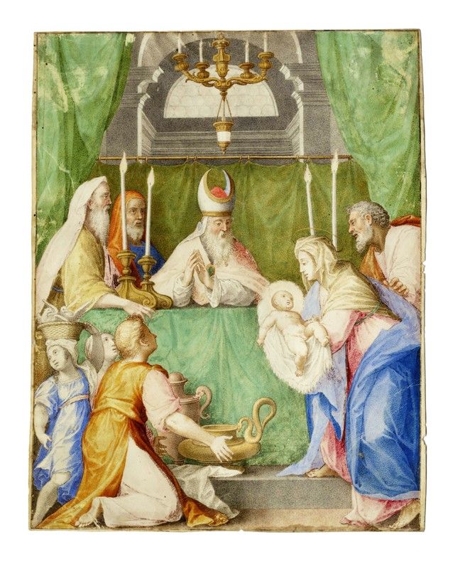 Tempera su pergamena. mm 230x180. Provenienza: collezione Tammaro De Marinis. Piccolo dipinto su pergamena di raffinata fattura verosimilmente riconducibile alla mano di artista marchigiano della cerchia di Lorenzo Lotto (Venezia,1480-Loreto,1556) o tra i suoi stretti seguaci. La composizione trova riscontro in un piccolo riquadro di stesso soggetto e schema compositivo tra quelli raffiguranti i misteri nella Madonna del Rosario di Lelio Leoncini, pittore marchigiano attivo nella seconda metà del XVI secolo. Il dipinto è firmato e datato 1589. La presentazione di Gesù al tempio del Leoncini, di fattura piuttosto sommaria, presuppone un precedente da ricercare in esempi di maestri della generazione del Lotto.