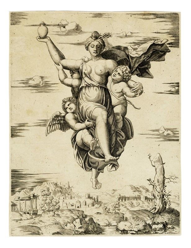 Bulino. mm 288x219. Foglio: mm 294x223. Bartsch, XV, 5. raphael invenit (mito), pp. 151-152, VII,7c. In basso a destra sulla lastra "ANT. LAFRERI". Dall'affresco di Raffaello nel pennacchio della Farnesina. Ottima impressione nel III stato su 3 censito da Stefania Massari la quale propone dubitativamente di assegnare l'esecuzione del foglio al Beatricetto. Carta vergellata lievemente spessa con filigrana "pellegrino con bastone sulle spalle in cerchio singolo" (simile a Woodward, 11. 1585 ca).