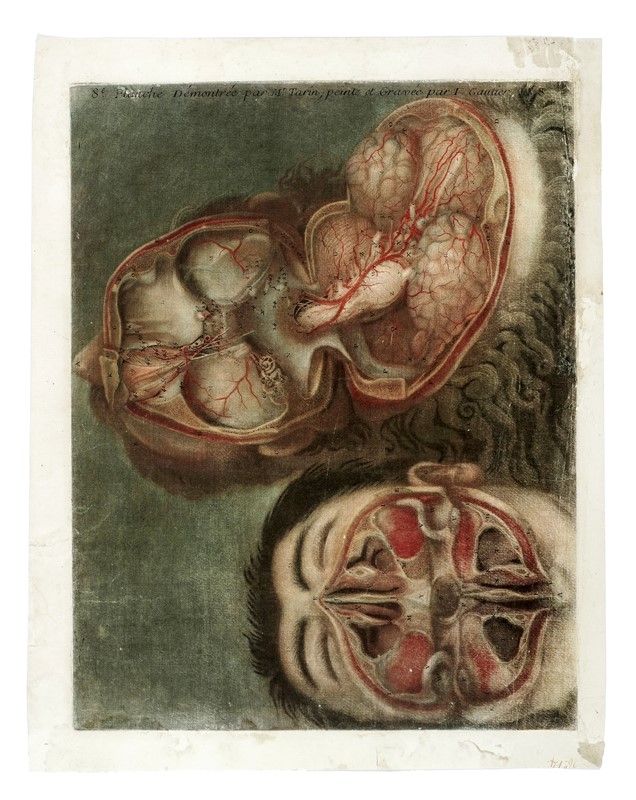 Mezzotinto a quattro colori. mm 410/675x315/470. Foglio: mm 460/820x360/550. Lotto di quattro tavole anatomiche, firmate in lastra, da Myologie complètte en couleur et grandeur naturelle, composé de l'Essai et de la suite de l'Essai d'anatomie, en tableaux imprimés, A Paris...1745-1748. Le lastre a grandezza naturale furono incise e stampate in quattro colori secondo un processo di mezzatinta a colori sviluppato per la prima volta da Jacob Christoph Le Blon (1667-1741), nel cui laboratorio Gautier d'Agoty aveva servito come assistente. Il primo progetto di Gautier fu la produzione di otto stampe del viso, del collo, della testa, della lingua e della laringe, che pubblicò nel 1745, seguite un anno dopo da un secondo gruppo di dodici stampe per lo più di dimensioni maggiori che mostravano i muscoli della faringe, del busto, delle braccia e delle gambe. Un anno dopo Gautier pubblicò le due opere insieme sotto il titolo generale Myologie Complette. Gautier preparò le lastre per le illustrazioni osservando cadaveri sezionati da Joseph Guichard Duverney (1648-1730), docente di anatomia al Jardin du Roi.