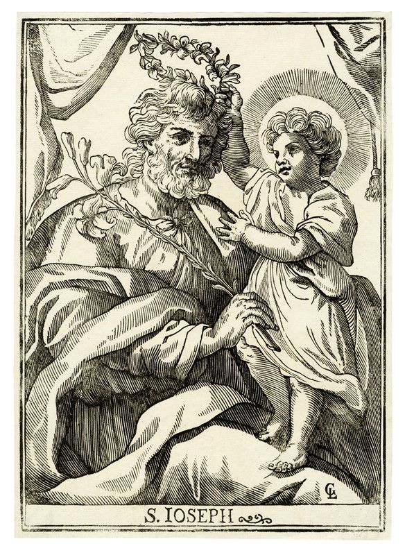 Xilografia. mm 352x253. Foglio: mm 360x261. Tavola con il monogramma "LC" (di Lucas Cranach) incisa da matrice Soliani riveduta da Pietro Barelli. Il negoziante di stampe Pietro Barelli acquistò dai Soliani le matrici xilografiche sulle quali poi inserì tasselli con monogrammi apocrifi per facilitarne la vendita come stampe d'autore. San Giuseppe incoronato da Gesù Bambino è un motivo tipico della devozione del santo, diffuso dai Gesuiti in analogia con l'incoronazione di Maria. Ottima prova su carta vergellata sottile con filigrana "luna" (Heawood, 848). Bibliografia: Soprintendenza beni artistici e storici (a cura di), I legni incisi della Galleria Estense. Quattro secoli di stampa nell'Italia settentrionale, Modena 1986, n.136 (riprodotto).