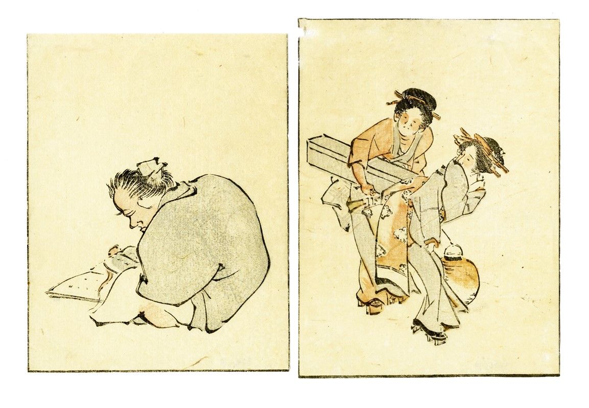Tanshokuzuri (Xilografia in nero, grigio, rosa pallido, verde e blu). mm 190x138. L'autore fu ben noto nel mondo letterario e artistico di Kyoto e nel suo repertorio Bunsen gafu illustra molte scene della tradizione giapponese con fiori e animali, uccelli e sacerdoti, personaggi mitologici, come il domatore di demoni Shoki, e vedute di campagna. Uno dei fogli è una pagina forse di frontespizio.