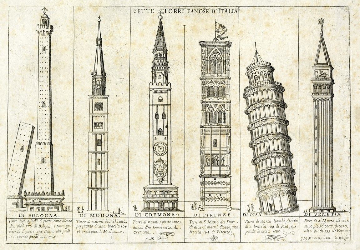 Acquaforte. mm 257x375. Foglio: mm 324x420. Buscaroli, 71. Varignana, 488. Firmata e datata in basso a destra "G. M. Mitelli inv. 1701. in Bologna". Curiosissima stampa di carattere popolare, In alto al centro il titolo, e in basso entro sei riquadri le torri con indicazione della città e la legenda: DI BOLOGNA/Torre degli Asinelli di pietre cotte dicano/alta piedi 376. di Bologna; e Torre Ga/risenda di pietre cotte, dicano alta piedi/130, e pende piedi otto./DI MODONA./Torre di marmi bianchi alta, /per quanto dicano , braccia 164./ et oncie otto di Modona./DI CREMONA,/ Torre di marmi e pietre cotte/ dicano alta braccia 252. di /Cremona./ DI FIRENZE./ Torre di S. Maria del Fiore/di diversi marmi bianchi, dicano, /alta braccia 109. di Pisa, e/pende braccia sette. /DI VENETIA./Torre di S. Marco di mar/mi , e pietre cotte, dicono, /alta piedi 333 di Venetia. Bella prova stampata con ottima definizione su carta vergellata con filigrana "lettere GM in cerchio singolo sormontato da trifoglio" (Bologna, prima metà XVIII secolo).