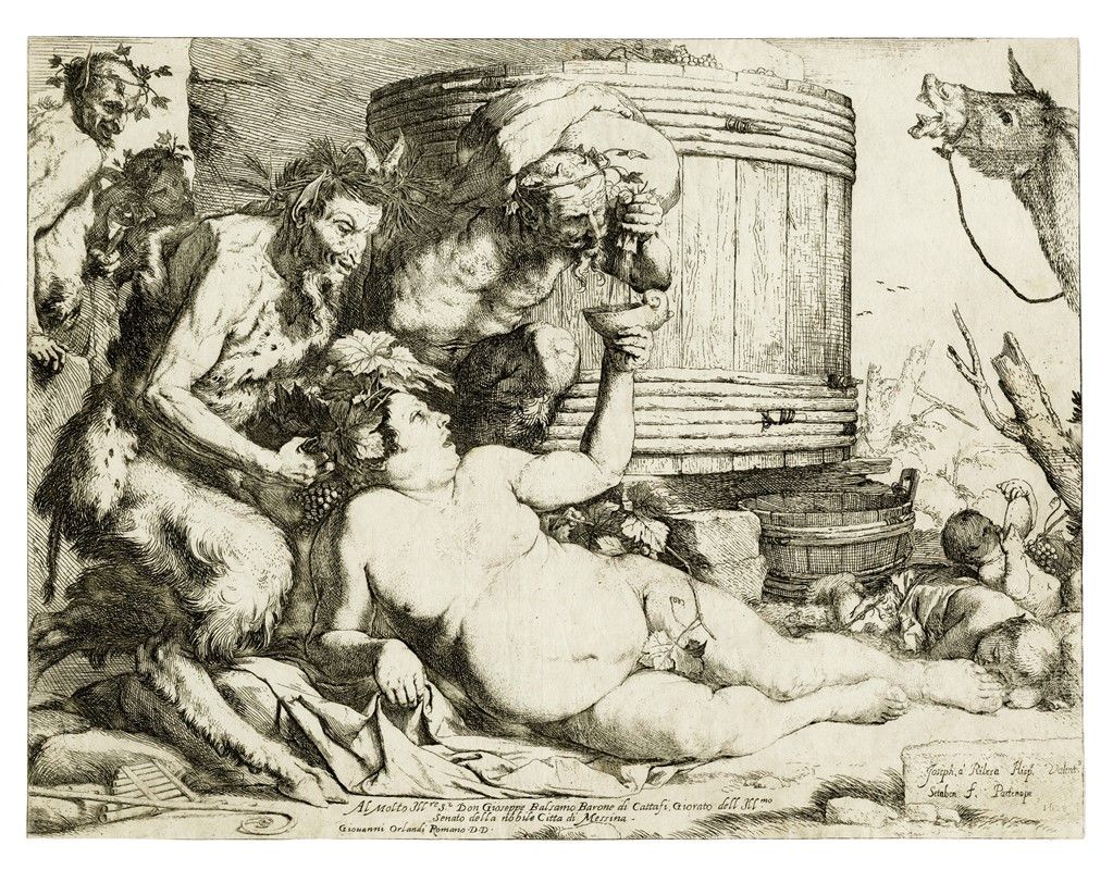Acquaforte e bulino. mm 267x342. Bartsch, XX, 13. Brown, 14. Con la firma e la data in lastra sulla pietra a destra. In basso al centro la dedica "Al Molto Ill[ust]re Sr Don Gioseppe Balsamo Barone di Cattasi, Giorato dell Ill.mo / Senato della nobile Citta di Messina / Giovanni Orlandi Romano. D. D.". Ottima impressione nel II stato di 3 con l'indirizzo di Giovanni Orlandi in basso, con il nome della città di nascita dell'autore e la città dove l'incisione è stata eseguita sulla pietra contenente la data. Carta vergellata sottile con filigrana "stemma con lettera F su tre monti" (simile a Woodward, 332 e 333).