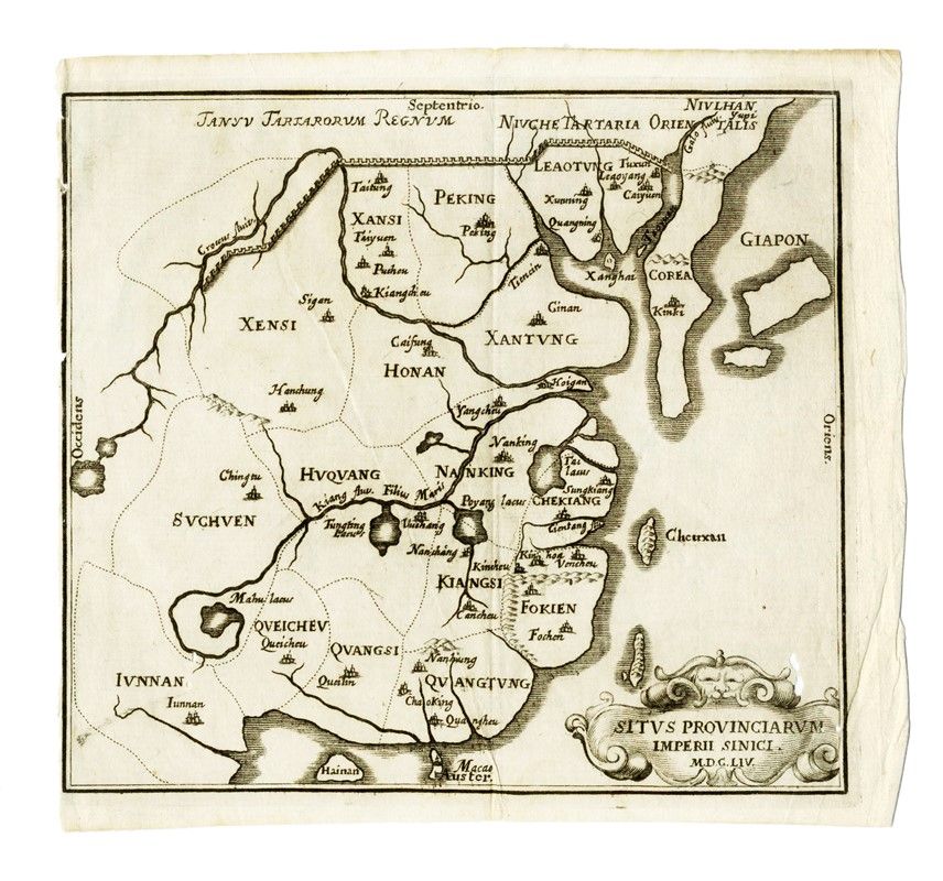 Incisione in rame. mm 150x164. Foglio: mm 160x175. Con il titolo e la data nel cartiglio con mascherone in basso a destra. Da De bello tartarico historia. Antverpiæ, ex officina Plantiniana Balthasaris Moreti, 1654. Il volume nell'edizione 1654 contiene questa unica carta che descrive le varie regioni della Cina con nomi e alcuni toponimi, la penisola della Corea e un abbozzo delle isole del Giappone. Nell'anno seguente è pubblicato in 9 edizioni: 4 in latino e 5 traduzioni in italiano, tedesco, francese, inglese e olandese. Martini giunse in Cina nel 1643 alla vigilia del collasso della dinastia Ming. Nel 1644 la dinastia tartara Manchu dei Qing sale al potere nel nord della Cina e si lancia alla conquista delle regioni meridionali. Martini è testimone oculare di gran parte degli eventi che racconta nel suo libro incentrato soprattutto sull'invasione della Cina da parte dei mancesi e la conquista delle regioni settentrionali e meridionali negli anni 1643-1645 ca.