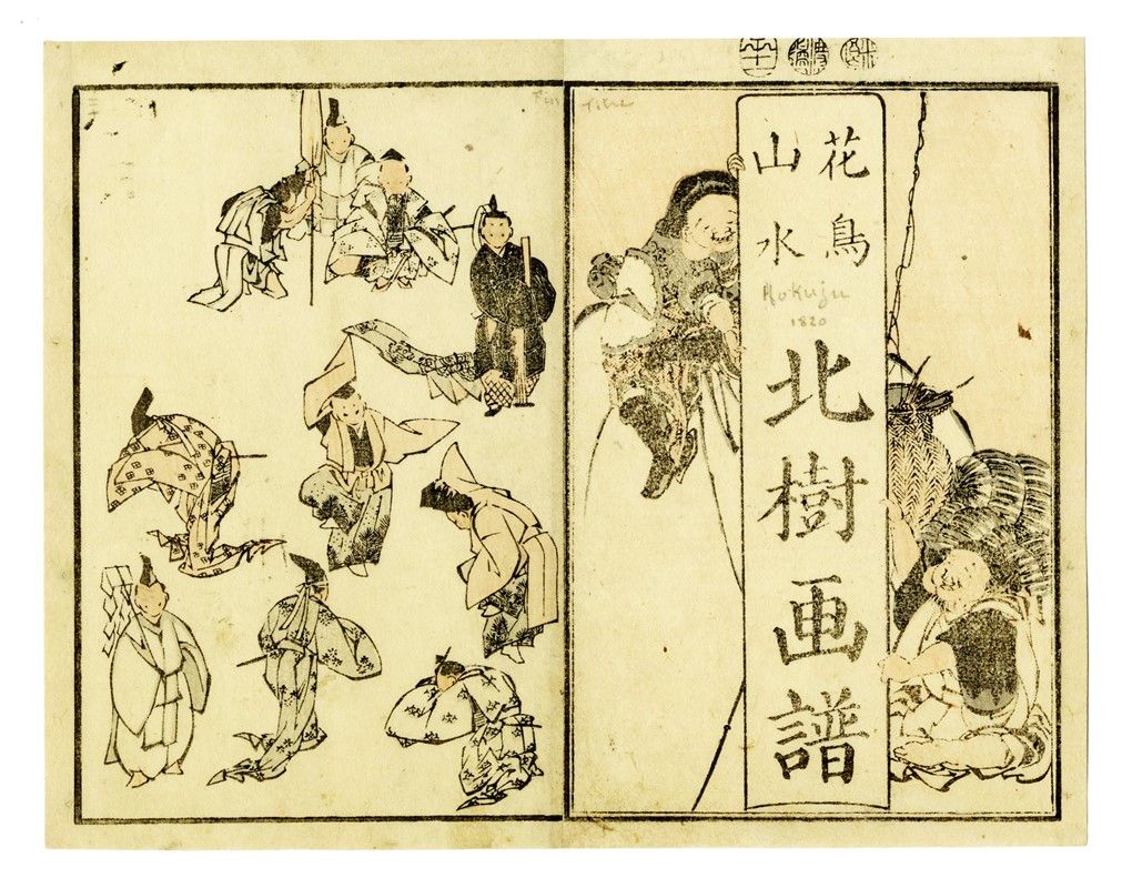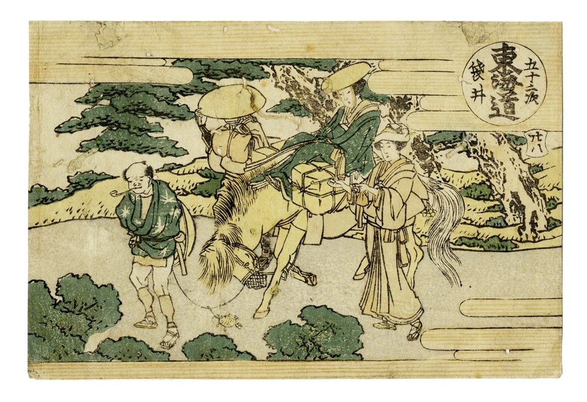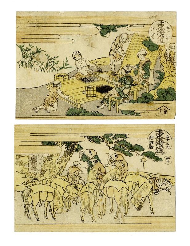 Xilografia a colori (nishiki-e). Formato: yotsugiri (un quarto di ôban) mm 115x170. Firma: non presente. Serie: Tôkaidô gojûsan tsugi (Le cinquantatre stazioni della Tokaido). Le tre tavole raffigurano la Stazione n. 3 Kawasaki, la Stazione n.28 Fukuroi e la Stazione n.40 Chiryû. SI AGGIUNGONO: Id., Due tavole da Hokusai Manga. 1814-1878., Xilografia in nero, grigio e rosa. mm 175x225.