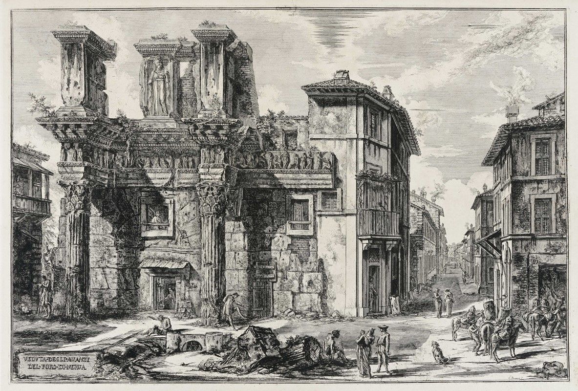 Acquaforte. mm 475x708. Foglio: mm 510x735. Focillon, 750. Hind, 95. Da Le Vedute di Roma. Bellissima impressione, nel I stato di 4 avanti ogni numerazione, stampata con inchiostrazione piena e brillante su carta vergellata pesante con filigrana "fiore di giglio in cerchio singolo sormontato da lettera V" (Robison, 11).