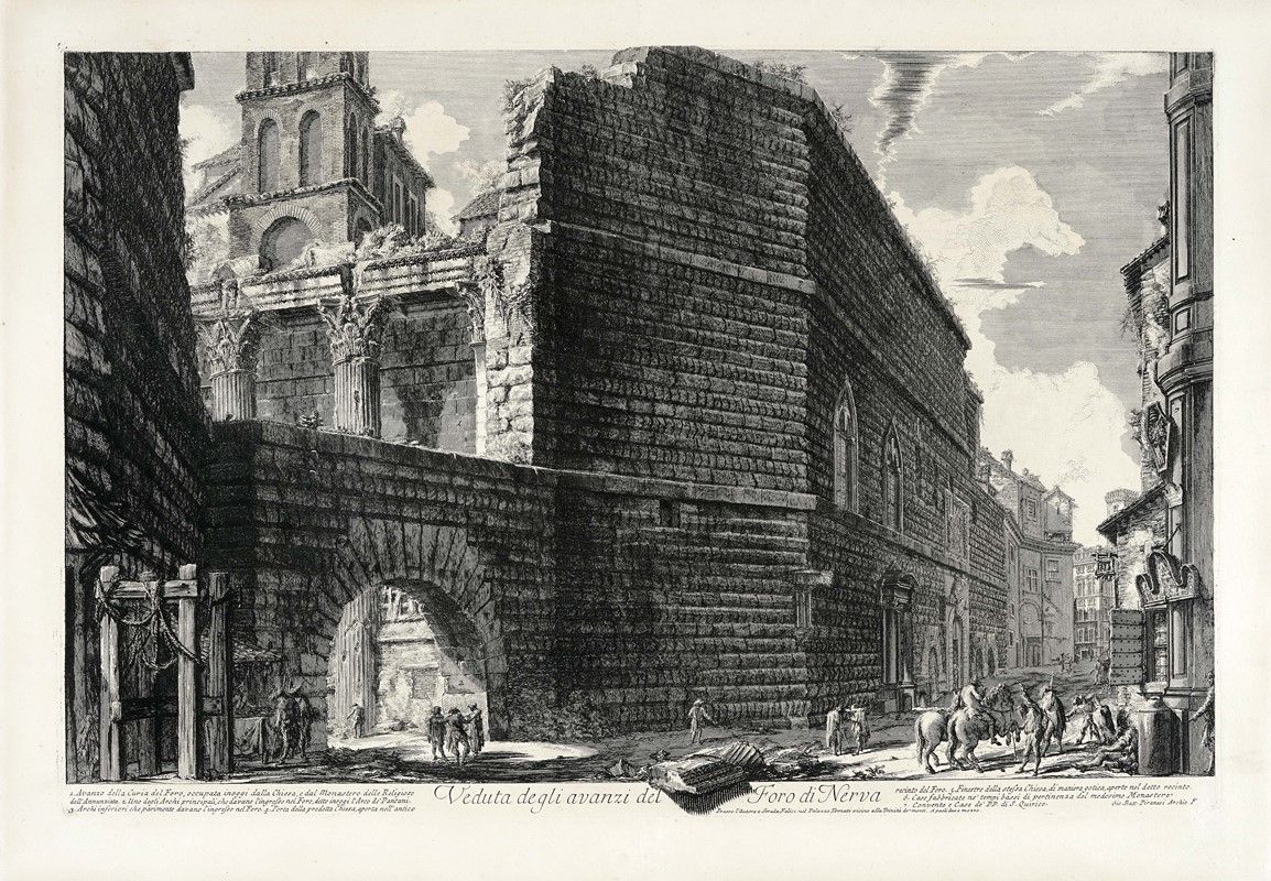 Acquaforte. mm 404x6177. Foglio: mm 488x695. Focillon, 749. Hind, 42. Da Le Vedute di Roma. Bellissima impressione, nel II stato di 7 avanti ogni numerazione, stampata con inchiostrazione piena e brillante su carta vergellata pesante con filigrana "fiore di giglio in doppio cerchio sormontato da lettere CB" (Robison, 39).