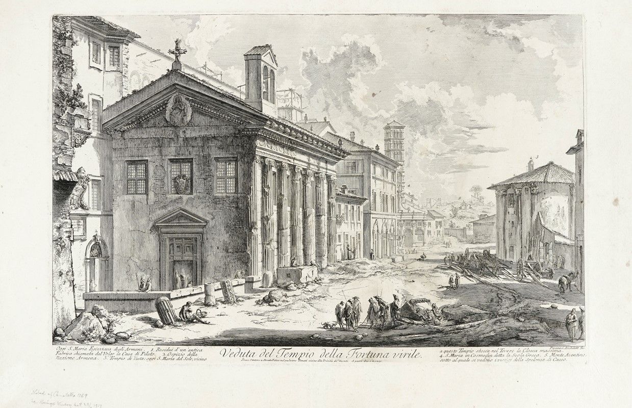 Acquaforte. mm 375x585. Foglio: mm 458x727. Focillon, 817. Hind, 46. Da Le Vedute di Roma. Bellissima impressione, nel IV stato di 7 dopo alcuni punti di nuova morsura per scurire il terreno in primo piano, stampata con inchiostrazione piena e brillante su carta vergellata pesante con filigrana "fiore di giglio in doppio cerchio sormontato da lettere CB" (Robison, 35).