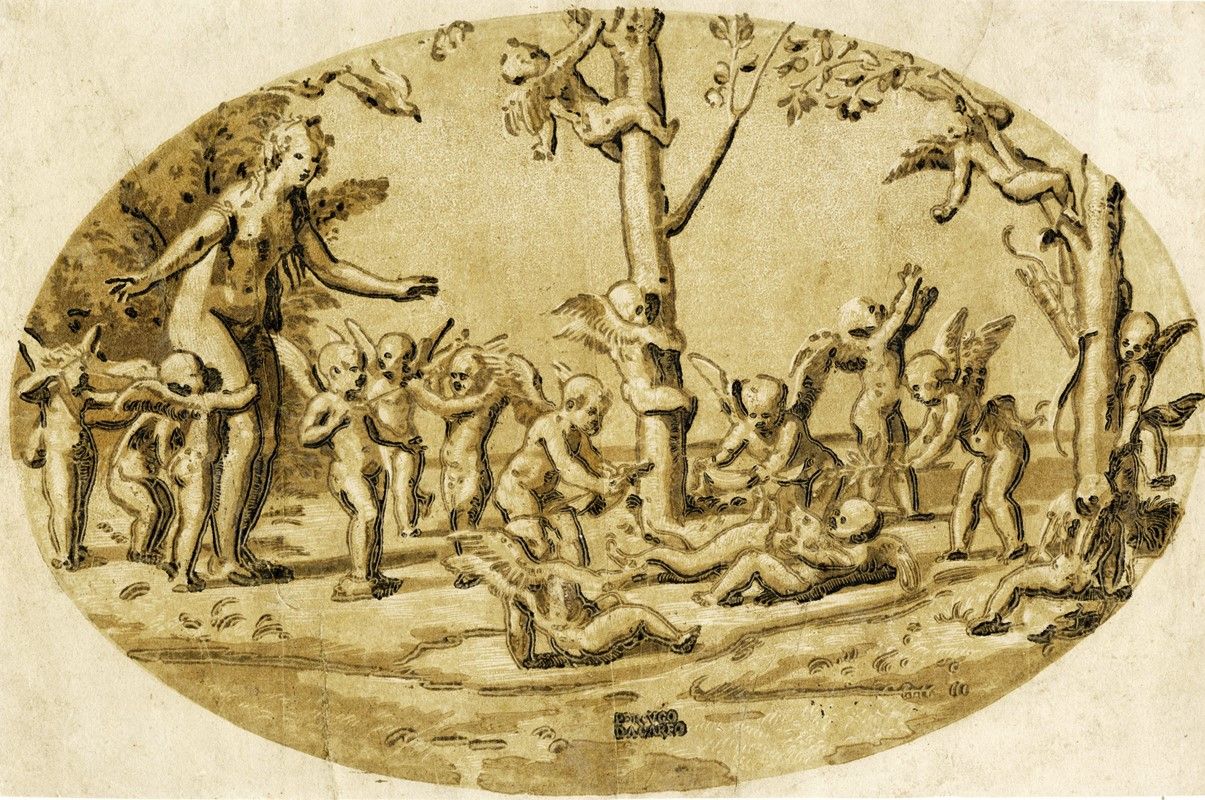 Chiaroscuro in quattro legni. mm 270x405. Foglio: mm 275x412. Bartsch, XII, 3. Takahatake, pp.19-21, figg.9-10. In basso al centro "per ugo / da carpo". Da un disegno di Raffaello o della sua cerchia eseguito attorno al 1520 per la decorazione ad affresco della loggia del giardino di Villa Madama, portata a termine dopo la morte del maestro sotto la direzione di Giulio Romano e Giovanni da Udine. Bellissima prova nell'unico stato con bel gauffrage al verso, impressa su carta vergellata priva di filigrana.