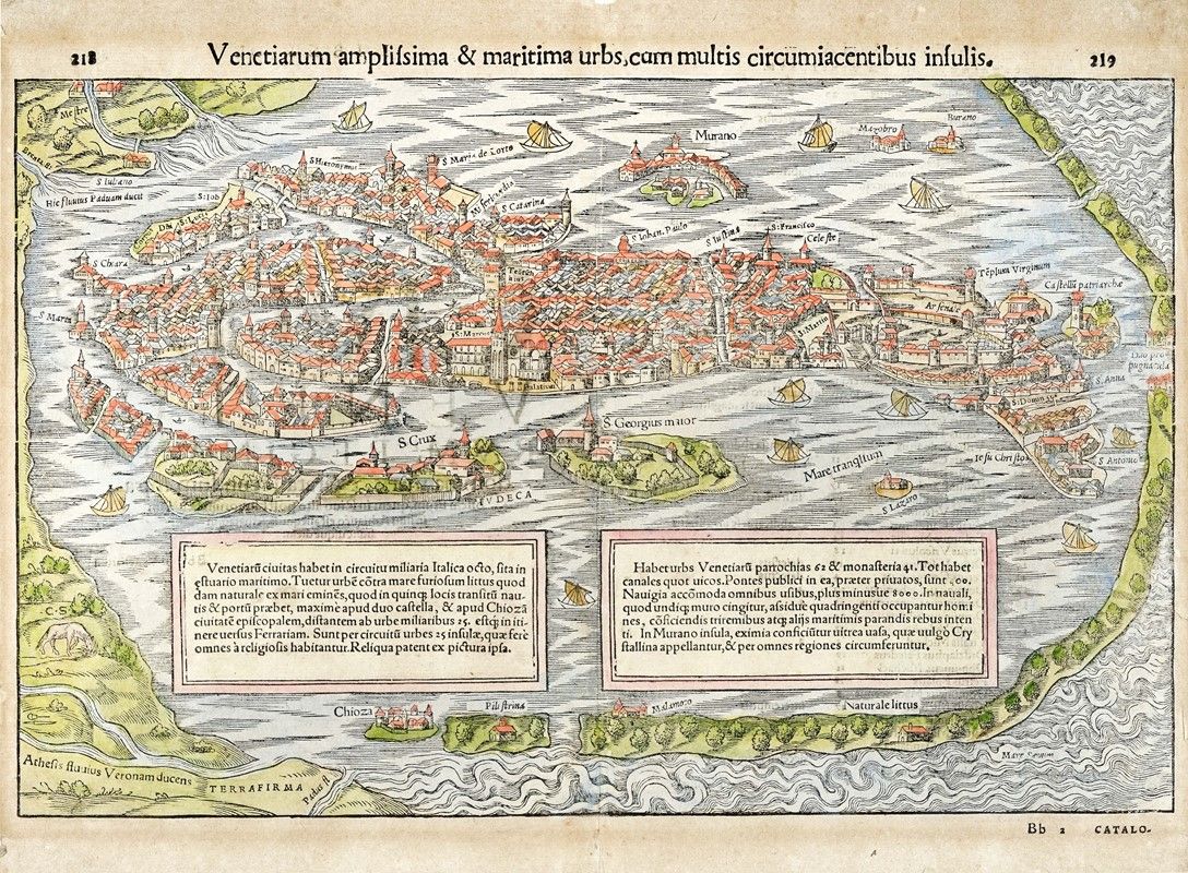 Xilografia in coloritura. mm 270x315. Foglio: mm 395x402. Da Cosmographiae Universalis, edizione latina 1572, libro VI pag. 218 e 219.