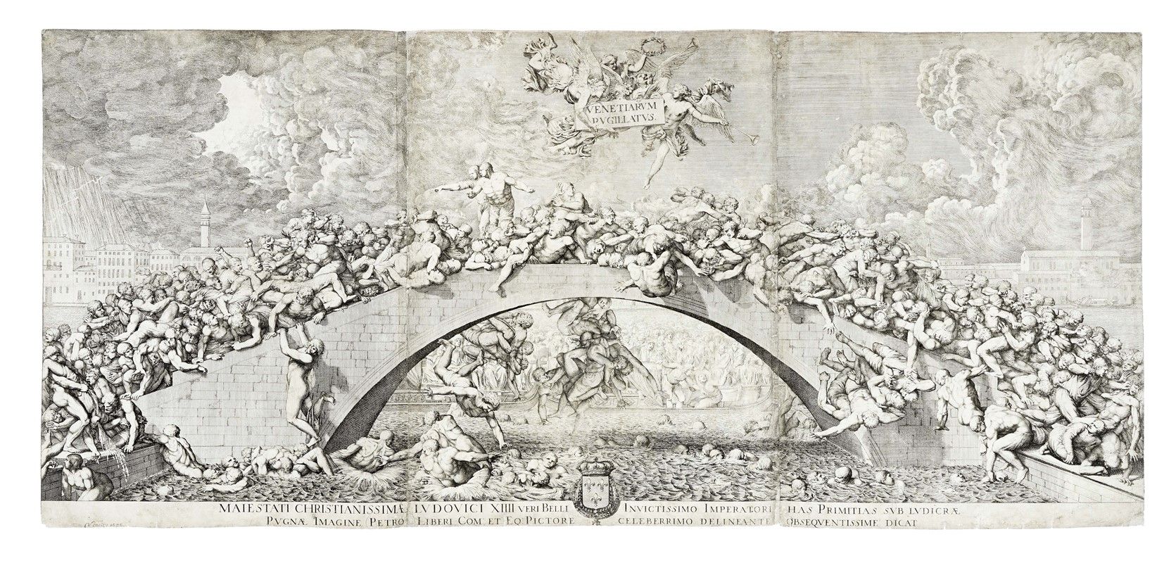 Acquaforte su tre lastre. mm 575x1290. Al margine inferiore a sinistra si legge "Venetiis 1676". Da un'invenzione di Pietro Liberi (Padova, 1605 - Venezia, 1687) come riportato nella dedica in basso. In alto al centro il titolo entro tabella rettangolare sorretta dalla Fama e da altre figure alate con lunghe trombe. Al margine inferiore la scritta dedicatoria "Maiestati Christianissimae Ludovicii XIIII veri Belli Invictissimo Imperatori has Primitias sub ludicrae; pugna imagine (Petro Liberi Com: et eq: pictore celeberrimo delineante) obsequentissime dicat", da Pietro Liberi all'imperatore Ludovico XIV il cui stemma campeggia al centro dell'iscrizione. La scena illustra il pugliato - sul cosiddetto Ponte dei Pugni, nel sestiere di Dorsoduro, nei pressi di Campo San Barnaba - tra le fazioni dei Nicolotti (abitanti della zona di San Nicolò dei Mendicoli, inclusiva di Santa Croce, San Polo e parte di Dorsoduro e Cannaregio) e i Castellani (Zona San Marco, restante parte di Dorsoduro e Cannaregio, Lido e, naturalmente, Castello). Scopo di questo gioco tradizionale era far cadere in acqua l'avversario, al quale era però consentito di tornare sul ponte e riprendere a combattere finchè gli reggevano le forze. La lotta fu regolamentata dal governo Veneziano intorno al 1292 per cui le zuffe erano ammesse solo da Settembre a Natale; fu proibita nel 1705. Bellissima impressione brillante e pienamente definita, su carta vergellata pesante. Causa resezione del foglio non è possibile appurare la responsabilità di edizione posizionata al margine in basso a destra (I stato con l'indirizzo di Giovan Battista Finazzi, II stato con l'indirizzo di Ludovico Furlanetto).