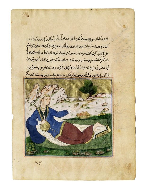 Tavola da Jami al-Tavarikh (compendio delle cronache) con Yunus (Giona) e la balena. Secondo il Corano Allah punì Giona per aver disubbidito ordinando a una grossa balena di inghiottirlo ma senza morderlo o ferirlo. Così Giona si trovò dentro un triplice profondo buio: il ventre della balena, il buio dell'abisso del mare e il buio della notte. Giona implorò Dio dicendo:” Non c’è altro dio all’infuori di Te, gloria a Te, sono stato ingiusto”. Rimase tre giorni nello stomaco della balena, glorificando Allah, allora Dio ordinò alla balena di vomitarlo sulla riva. Giona uscì dal freddo e il buio del mare, verso il calore e la luce del sole. L'illustrazione molto diffusa nella cultura islamica raffigura Giona nel momento in cui la balena lo abbandona sulla riva. SI AGGIUNGE: Pagina con Immagine tratta da un affresco di scuola persiana del XVII secolo nel palazzo Chehel Sotoun a Esfahan.