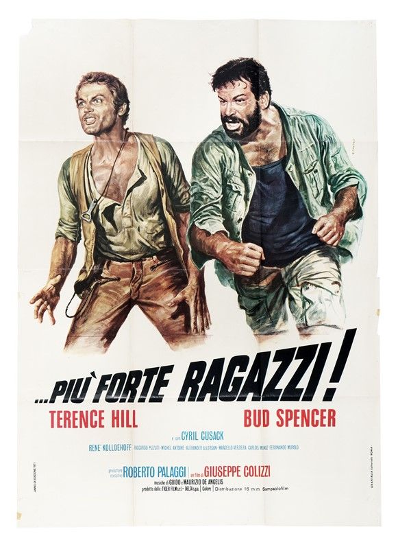 Stampa a retino offset in 2 fogli. Firmato in lastra al margine destro. Titolo, cast e dati editoriali a stampa al margine inferiore. Pellicola comica diretta da Giuseppe Colizzi ed interpretata dal duo Bud Spencer e Terence Hill.