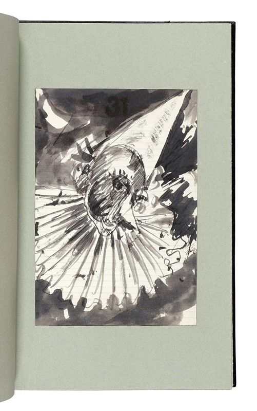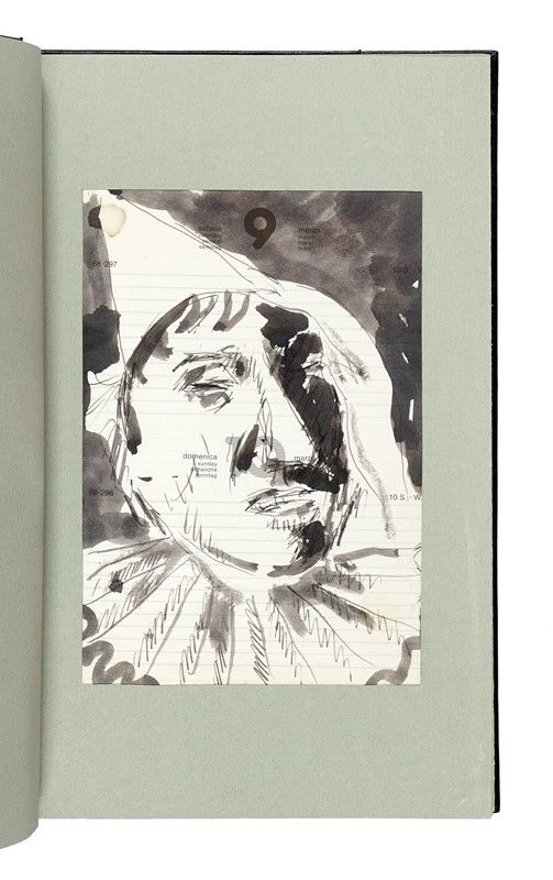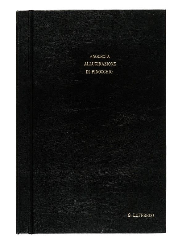 Penna e inchiostro di china, acquerello, pennarellino rosso e tempera bianca su pagine di agenda, ciascuna montata in passe-partout salvia e poi in album. mm 190x130 circa cad. Serie di 25 bellissime illustrazioni progressivamente più cupe racchiuse in elegante album in eco-pelle nera con nobilitazioni oro. La firma di Loffredo compare solo a stampa nell'angolo inferiore del piatto.