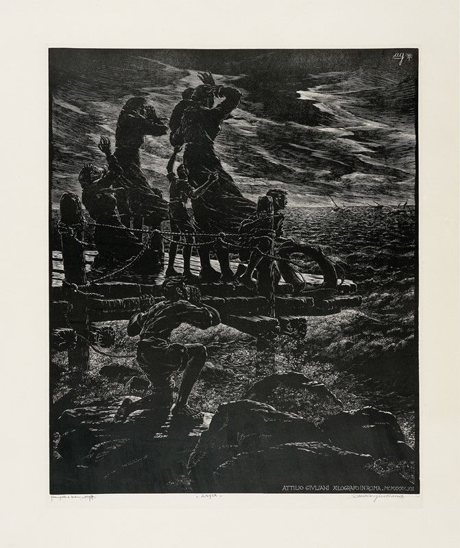 Xilografia. mm 555x460. Foglio: mm 580x470. Siglata in lastra all'angolo superiore destro, iscrizione "ATTILIO GIVLIANI XILOGRAFO IN ROMA. MCMXXXV. XIII" in lastra all'angolo inferiore destro. Firmata a matita in basso a destra, titolata a penna e inchiostro di china nero in basso al centro. Iscritto: "Stampata a mano" con ulteriore sigla d'artista a penna e inchiostro di china nera in basso a sinistra. Controfirma ed iscrizione a matita "Silografia in Roma al Viale delle Medaglie d'oro 190" al verso del supporto.