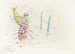 Matita, tempera, acquerello e pennarello a feltro su carta. cm 51x33. Firmato a matita in basso a destra. Accompagna [..]