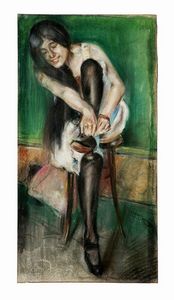 Pastelli e carboncini colorati su carta ruvida filigranata. mm 472x250. Firma poco leggibile in basso a sinis [..]