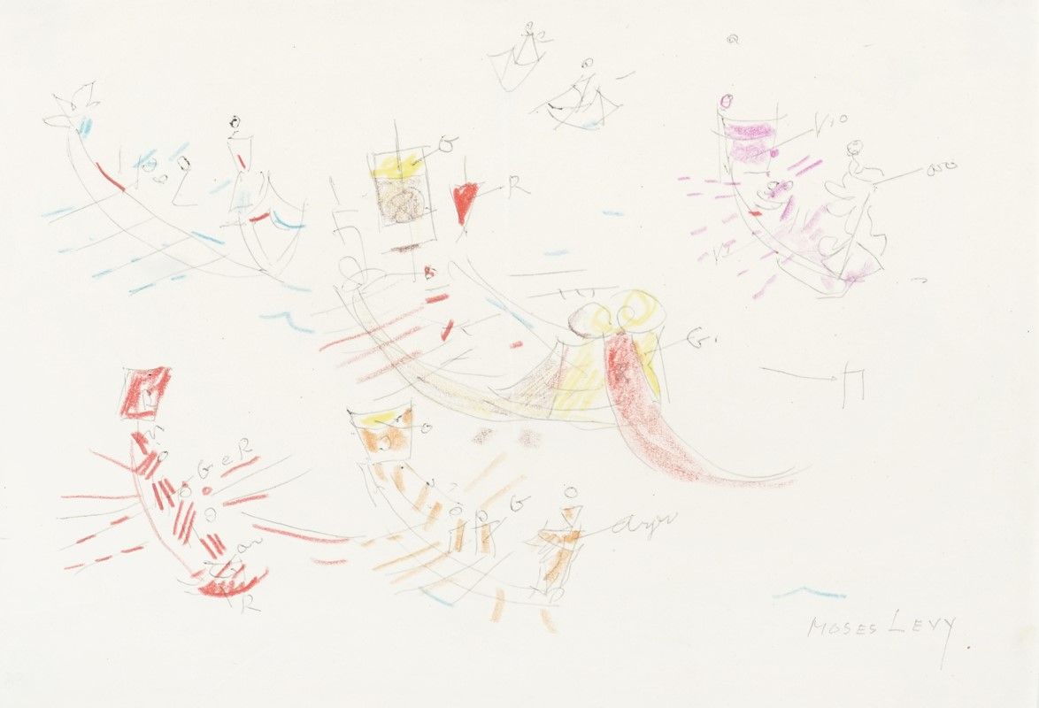 Matita e pastelli colorati su carta. mm 160x230. Firma a matita in basso a destra. Annotazioni di colore iscritte a matita vicino ad ogni imbarcazione. Timbro ad inchiostro celeste di Libreria Prandi con codice "486" a penna a sfera blu sull'angolo inferiore destro del verso. L'autenticità dell'opera è stata confermata dal Prof. Francesco Bosetti.