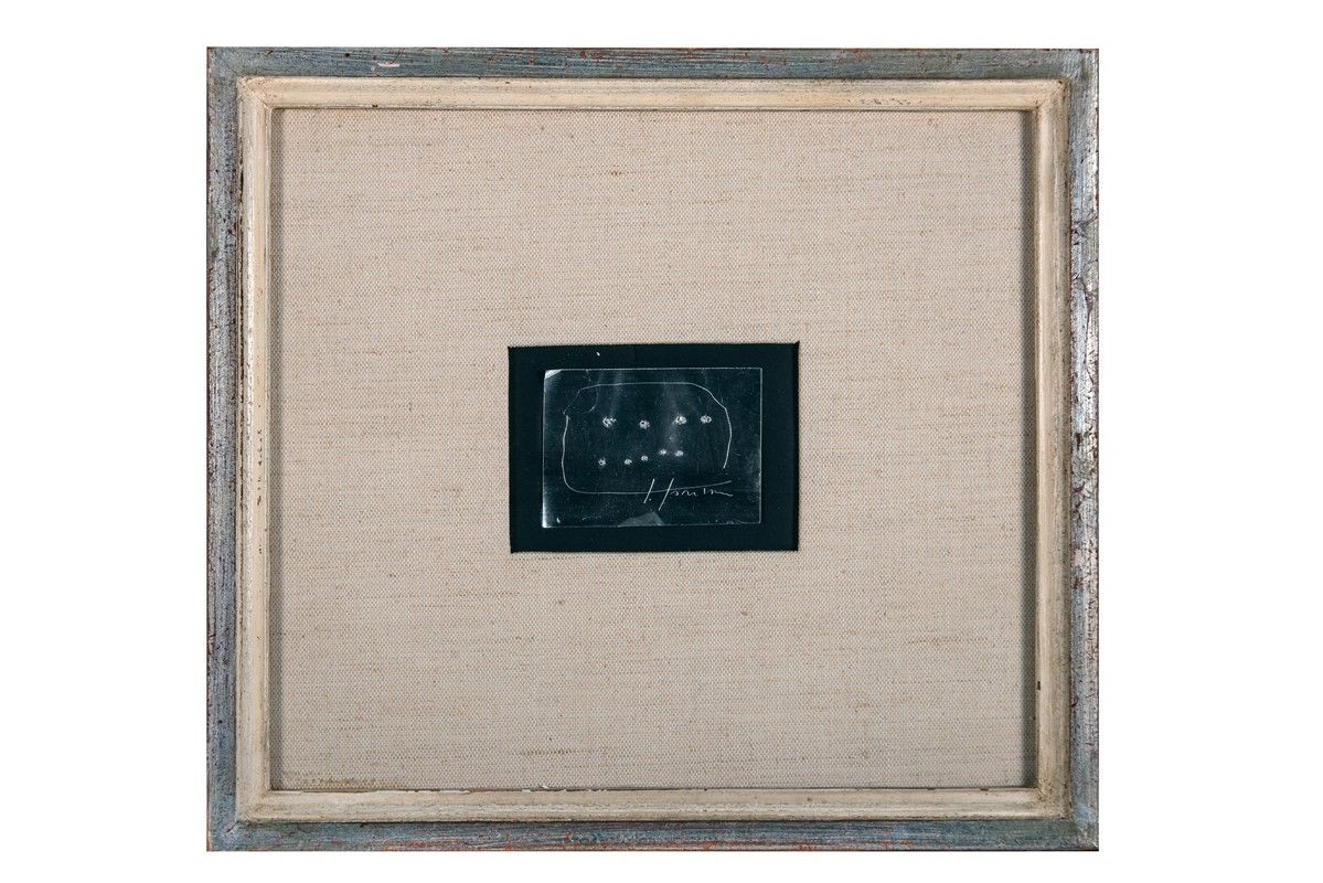 Buchi e graffito su carta stagnola argento applicata a cartoncino. mm 54x74. Firma in basso a destra. Al verso del cartoncino nero al quale l'opera è applicata, iscritto: Auguri, 1961. Opera accompagnata dal certificato di autenticità su fotografia della Fondazione Lucio Fontana. Molto raro il supporto.