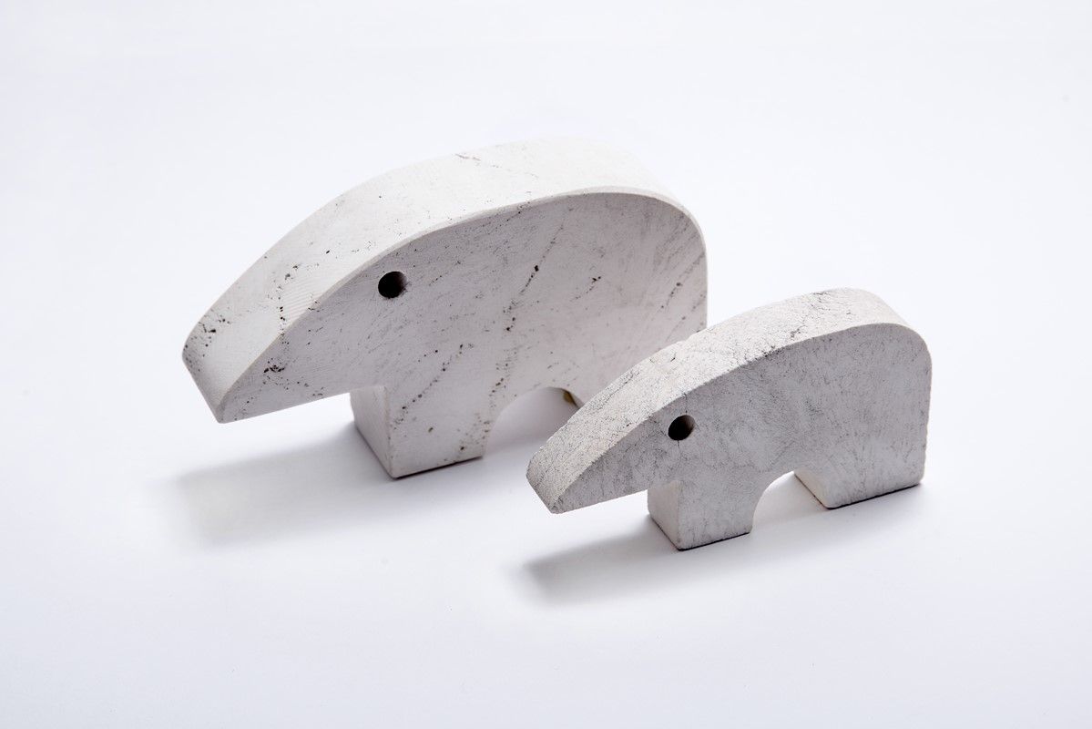 Coppia di piccoli orsi polari in travertino. cm 5,5/7x10/13x2/3. Entrambe le sculture presentano due etichette incollate sotto i fondi: "Vero travertino di Rapolano" da una parte ed etichetta dei produttori "Designers F.lli Mannelli made in Italy" dall'altra. Divertenti pietre a sagoma animale realizzate da Enzo Mari che ne disegnò moltissimi esemplari, tutti rappresentanti specie differenti. La forma, possibilmente pensata per l'incastro con altri pezzi, è un tema ricorrente nell'operato del designer. Troviamo lo stesso linguaggio espressivo usato ne' Il Gioco delle Favole ed i puzzle didattici a 16 animali progettati precedentemente in legno sagomato.