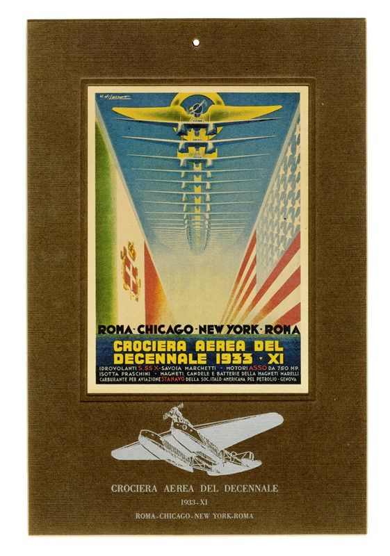 Offset applicato al cartone ufficiale con i dati dell'opera. mm 180x130. Firma nella lastra in alto a sinistra. Sotto al centro titolo, "Roma-Chicago-New York-Roma" e "Idrovolanti S.55 X - Savoia Marchetti - Motori Asso da 750 HP. Isotta Fraschini - Magneti, candele e batterie della Magneti Marelli - carburante per aviazione Stanavo della Soc. italo - americana pel petrolio - Genova".