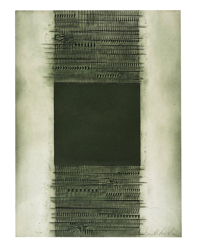 Acquaforte. mm 691x500. Firma a matita in basso a destra e tiratura in basso a sinistra. In basso a sinistra timbro a secco "Antoniniana Stamperia d'Arte". Es. 33/100.