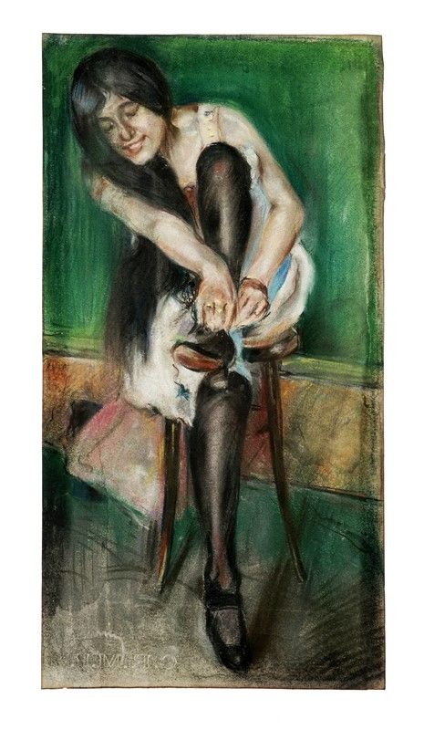 Pastelli e carboncini colorati su carta ruvida filigranata. mm 472x250. Firma poco leggibile in basso a sinistra.