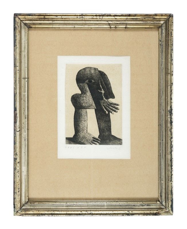 Acquaforte su velina applicata. mm 185x130. Foglio: mm 235x165 (visibile). Firmata a matita in basso a destra. Tiratura in numeri romani a matita in basso a sinistra. Al verso: Timbro ad inchiostro ed etichetta della Galleria D'Arte Del Cavallino di Venezia recante i dati dell'opera.