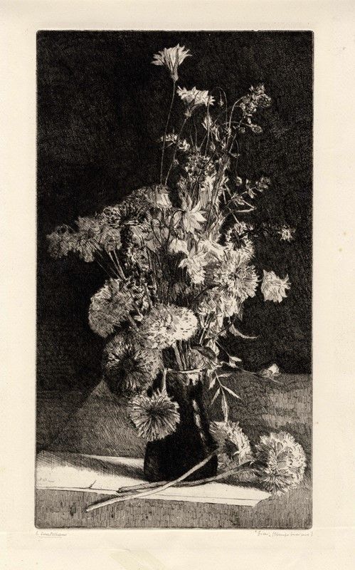 Acquaforte su velina applicata. mm 375x210. Foglio: mm 474x320. Firmata e datata in lastra in basso a sinistra. Controfirmata a matita in basso a sinistra. Titolo e "(Stampa fuori serie)" a matita in basso a destra. Bella impressione con grandi margini. Al verso: ulteriore impressione raffigurante una natura morta con pesci. Di questa seconda acquaforte è presente solo mezzo inciso, probabilmente una prova secondaria su stesso foglio.