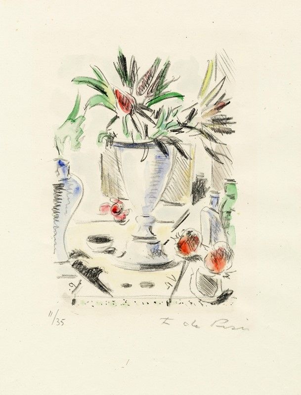 Litografia acquerellata a mano. mm 230x160. Foglio: mm 425x320. Firmata a matita in basso a destra, numerata a matita in basso a sinistra. Timbro a secco di Libreria Prandi all'angolo inferiore destro del foglio. Es. 11/35.