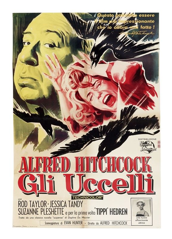 Stampa a retino offset in 2 fogli. mm 1350x930. Foglio: mm 1390x950. Titolato in lastra al margine inferiore, dati editoriali e cast a stampa sempre al margine inferiore del foglio. Iscrizione in lastra: "Questo potrebbe essere il film più impressionante che io abbia mai fatto!" con firma di Alfred Hitchcock al margine superiore. Iconica pellicola datata 1963 basata sull'omonimo racconto di Daphne du Maurier del 1953. Nel 1964 l'attrice debuttante Tippi Hedren vinse il Golden Globe, mentre il film fu nominato per i migliori effetti speciali agli Oscar dello stesso anno. La stessa attrice rivelò successivamente di essere rimasta traumatizzata dal lavorare con i volatili: i corvi ammaestrati crearono non pochi problemi a tutto il cast inseguendo e beccando gli attori, tanto da dover utilizzare alcune controparti per determinate scene.