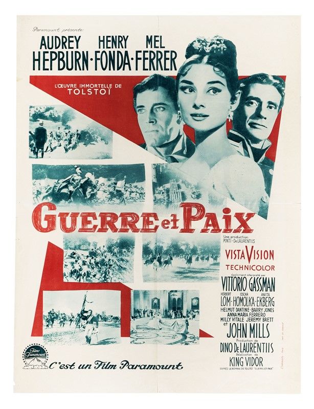 Litografia a colori e offset. mm 690x500. Foglio: mm 760x560. Titolato in rosso al centro del manifesto. Iscritti all'angolo superiore sinistro compaiono i nomi dei tre attori principali: Audrey Hepburn, Henry Fonda e Mel Ferrer. In basso a destra troviamo i crediti cinematografici, dove spicca Vittorio Gassman sotto la dicitura "également interprété par". Ripresa cinematografica prodotta da Paramount Films dell'omonimo romanzo di Lev Tolstoj del 1869.