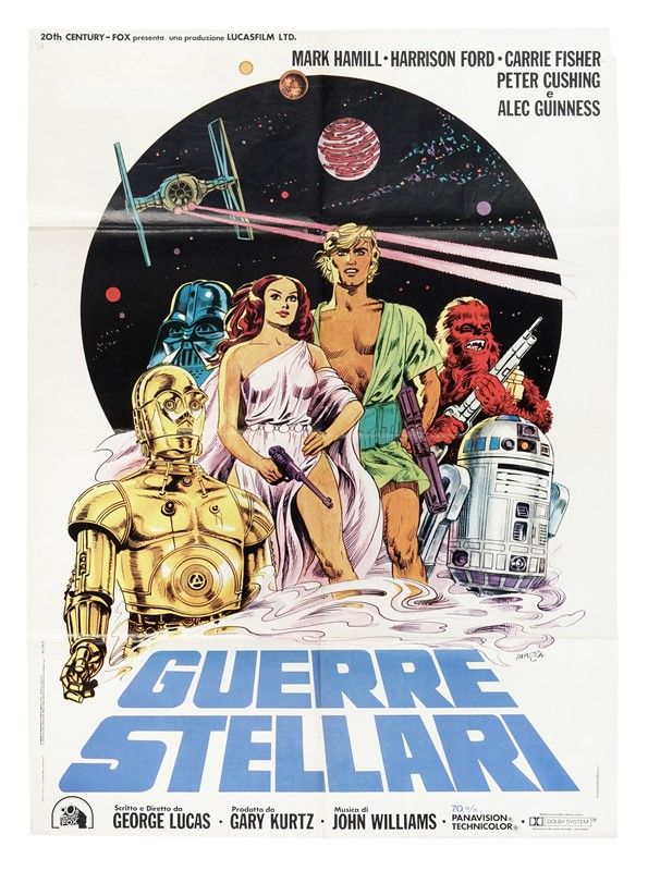 Stampa a retino offset in 4 fogli. mm 970x1340. Foglio: mm 1000x1400. Titolo, cast e dati editoriali in lastra al margine inferiore del secondo foglio. Prima edizione italiana del 1977 della celebre pellicola di George Lucas. Retroattivamente rinominata da Guerre stellari a Guerre stellari - una nuova speranza, episodio IV dopo la creazione delle diverse nuove trilogie. Esistono due versioni di locandina per lo stesso film: questa in particolare mostra l'illustrazione di Michelangelo Papuzza ideata per la distribuzione italiana.
