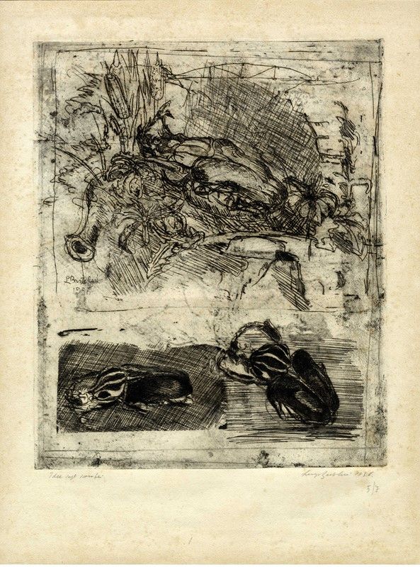 Acquaforte e acquatinta. mm 300x250. Foglio: mm 398x300. CORRADINI, 11. Firmata e datata in lastra al margine sinistro. Controfirmata, controdatata e numerata a matita in basso a destra. Titolata a matita in basso a sinistra. Opera conosciuta anche con il titolo di Coleotteri strani o Scarabei d'invenzione, come espresso nel catalogo citato che fa riferimento alla versione del 1930. Es. 5/7. Rara a trovarsi.
