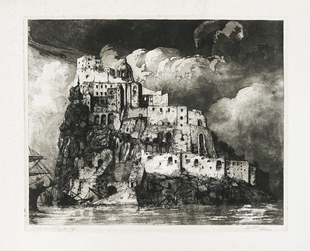 Acquaforte e acquatinta. mm 475x590. Foglio: mm 623x790. Spinazzé, n. 79. Firmata a matita in basso a destra. Titolo e numero di tiratura a matita in basso a sinistra. Es. 20/50. L'incisione è ispirata all'isola di Ischia e fu esposta ripetutamente nel 1914 a Roma, a Firenze e a Venezia. Rappresenta un traguardo importante nel percorso grafico dell’artista e notevole fu la fortuna espositiva dell’opera anche nei decenni successivi in Italia e all’estero. Rispetto a precedenti lavori sfumati intrisi di silenzio e di dolente misticismo crepuscolare, in questo foglio si esaltano le strutture arroccate e geometricamente compatte nella loro imponenza visionaria.